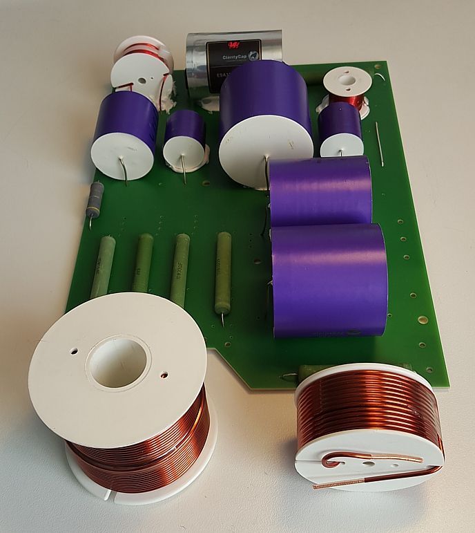 Frequenzweiche ausschließlich aufgebaut aus überragend klingenden, paarweise ausgemessenen High-End-Polypropylen-Kondensatoren (MKP) aus dem Hause "Clarity Cap", engtolerierten Metalloxid- und Bifilar-Widerständen, sowie hochbelastbaren, niederohmigen und verzerrungsfreien Backlack-Luftspulen aus dem Hause "Mundorf"