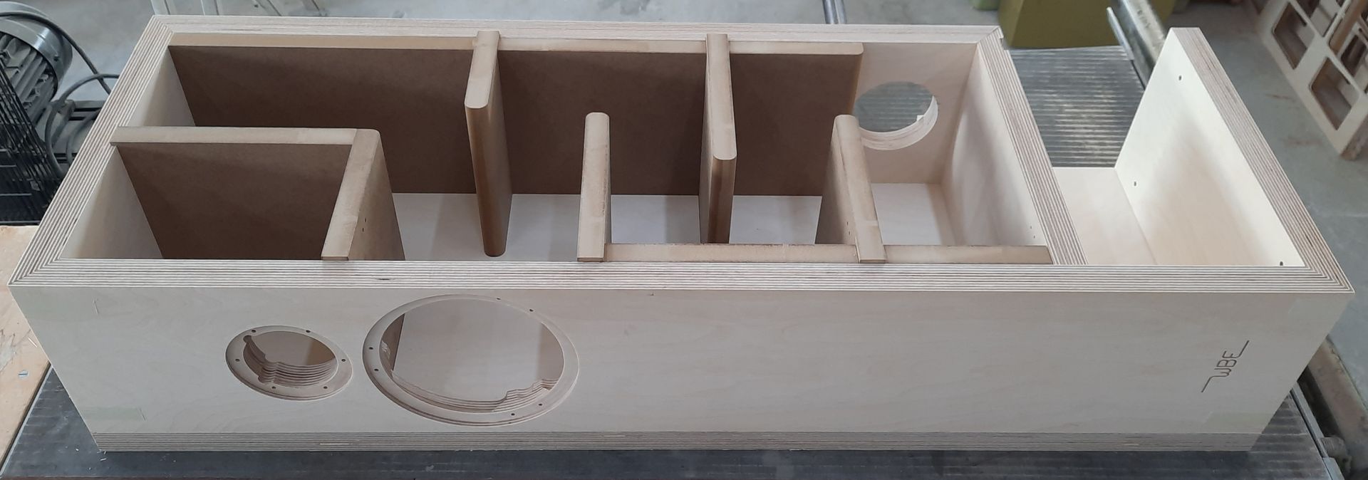Alle Sichtteile des Lautsprechergehäuses aus schicht-verleimtem 30 mm starkem Birken-Multiplex-Holz gefertigt